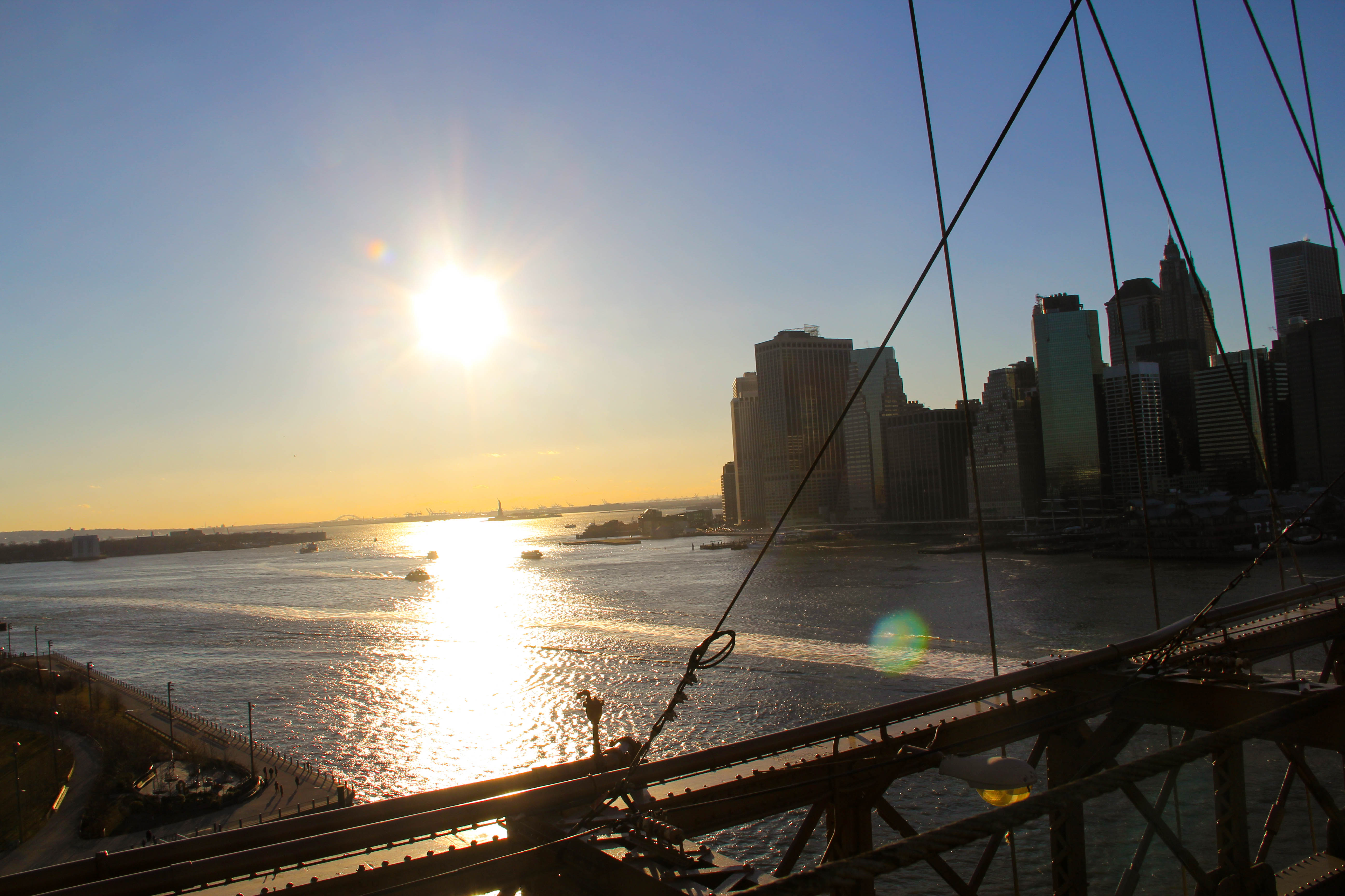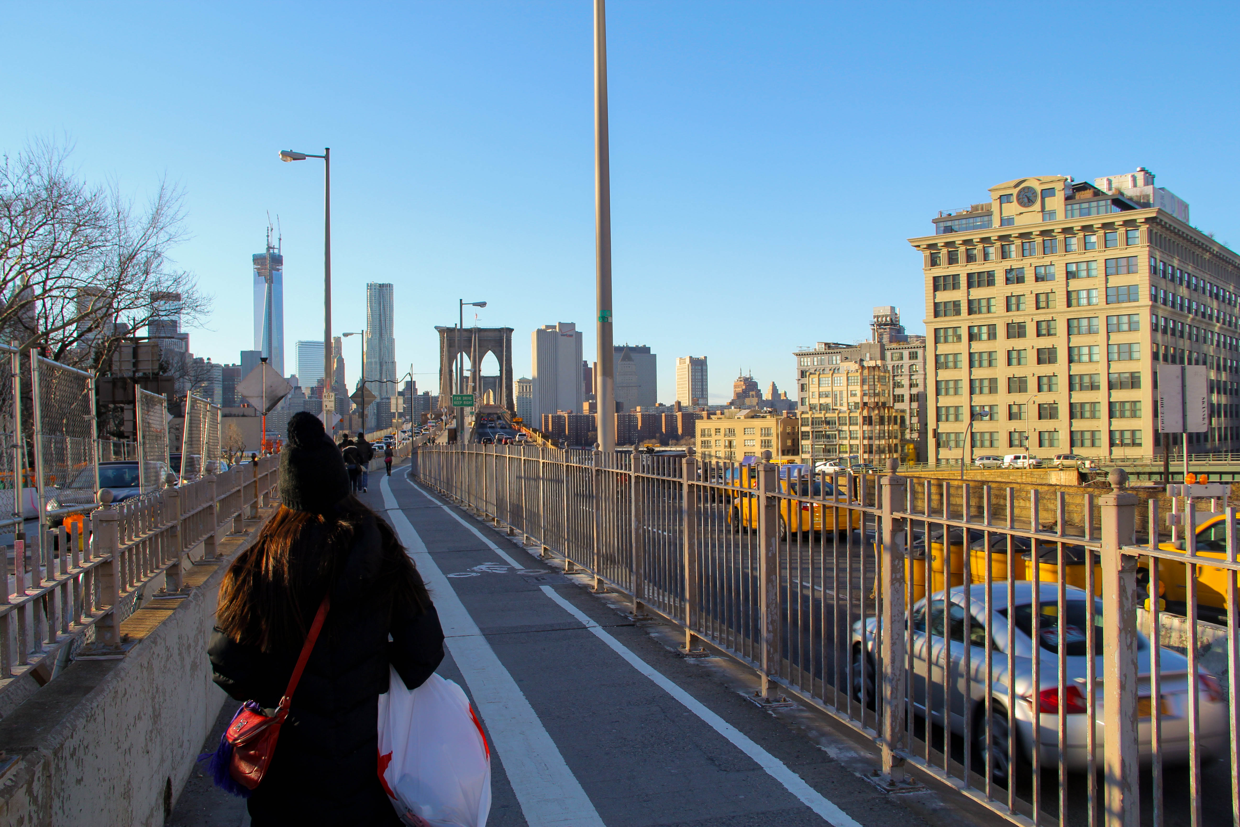 Agora subindo para a ponte, todo cuidado é pouco, já que você vai dividir o caminho com muitos ciclistas que usam a ponte tanto para esporte e lazer quanto para locomoção para o trabalho. Mantenha-se no caminho dos pedestres e fique atento para não sofrer um indesejado acidente. Mas mesmo esperto com as bikes, não deixe de dar uma parada para apreciar a Estátua da Liberdade bem pequena ao seu lado esquerdo (indo sentido Manhattan), principalmente se o sol estiver se pondo.